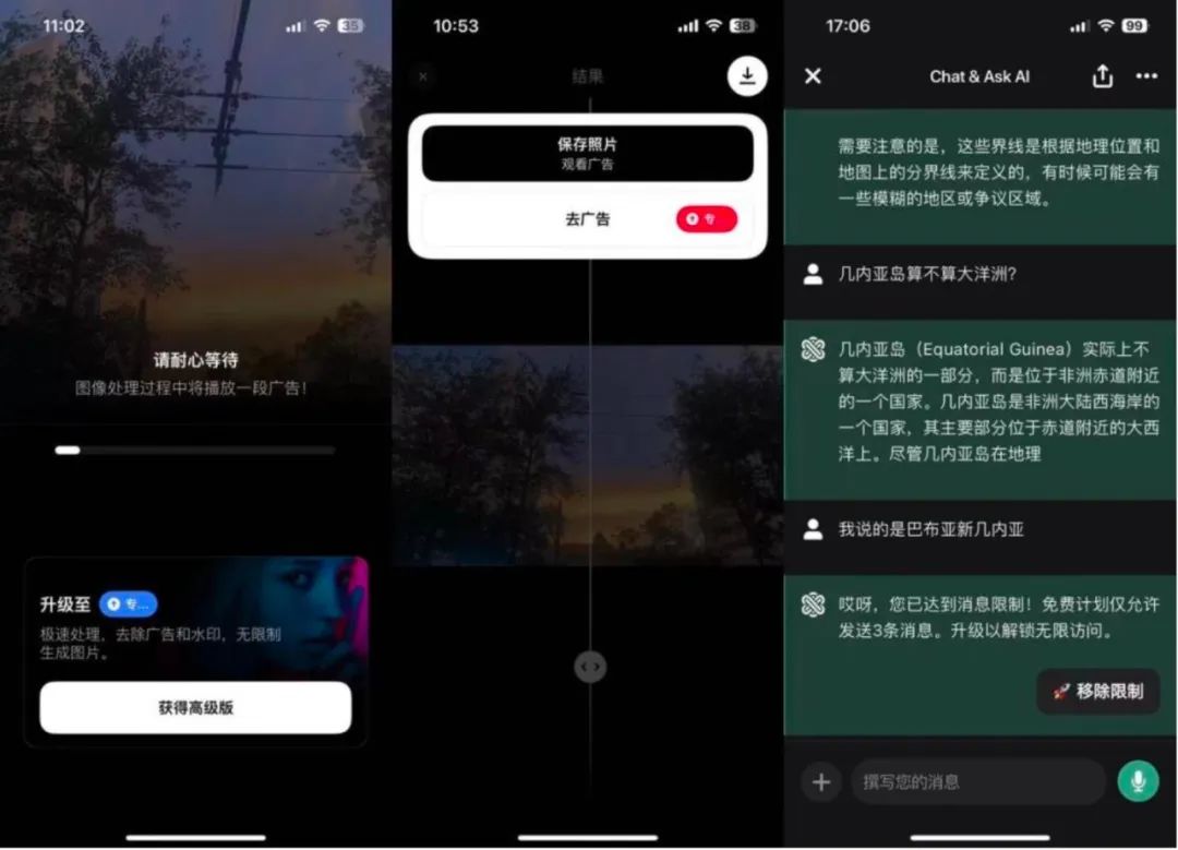 PhotoApp(左 2),Chat&Ask AI(右)引导付费的部分