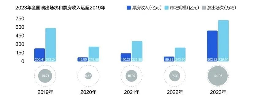 据中国演出行业协会,2023年国内演出总场次达到44.06万场,票房收入502.32亿元,均远超2019年全年水平,达到历史新高。从2024年第一季度以及五一假期的数据来看,演出市场的热潮在2024年上半年仍在延续。