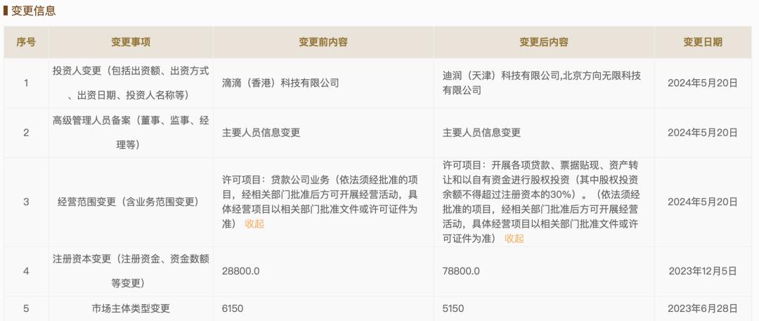 滴滴旗下「重庆市西岸小额贷款有限公司」(简称:西岸小贷)近一年变化很多,先是去年12月增资到7.88亿美元(约超50亿人民币),最近又变更了股东。