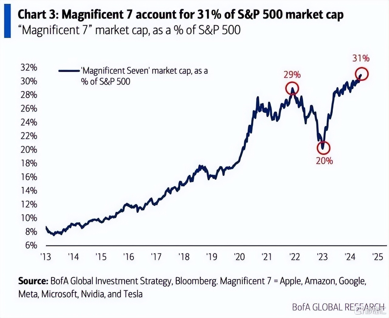 如今“Mag7”占标普500指数的总市值占比已经达到了31%,创下了历史新高。