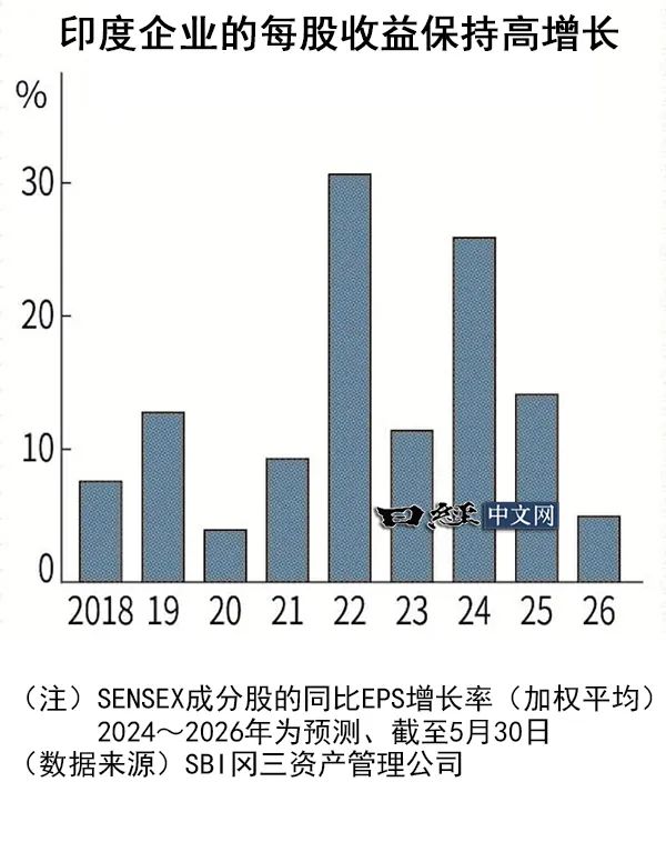 日本SBI冈三资产管理公司透露,2024年SENSEX成分股的每股收益(EPS)同比增长率达到25.9%,2025年为14.1%,市场预测将出现2位数的增长。
