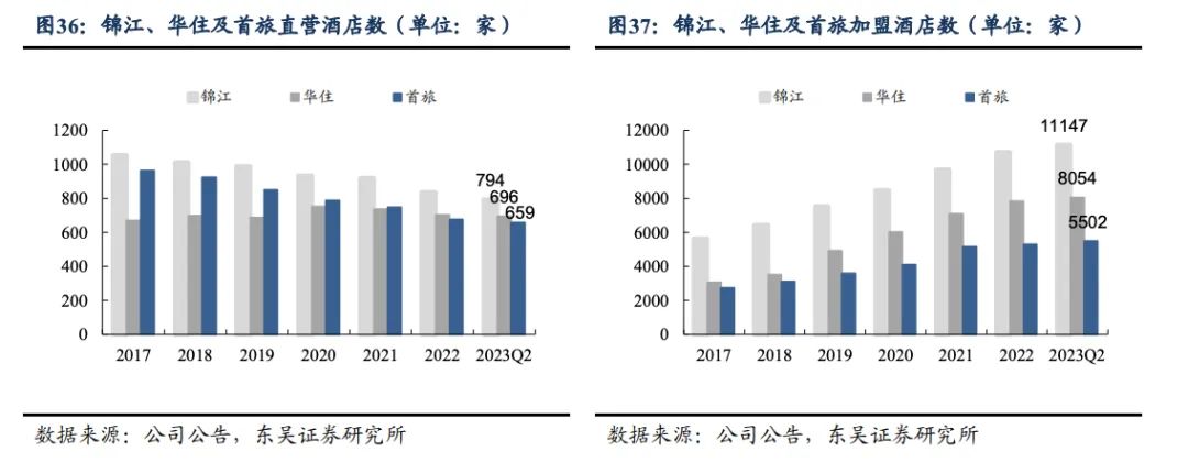 锦江酒店和首旅酒店也紧随其后,据统计,锦江2024年1至3月份,新增开业酒店222家,开业退出酒店75家,净增开业酒店147家;首旅2024年第一季度,公司新开店数量为205家,其中直营店2家,特许加盟店203家。