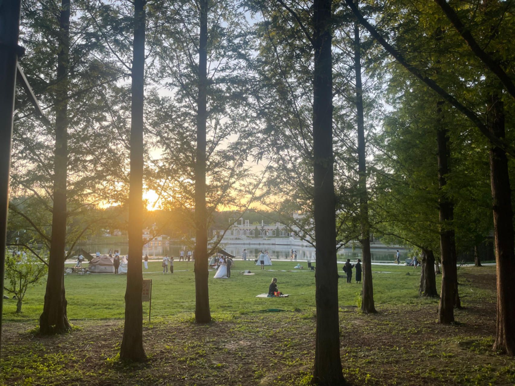 一到周末,朝阳公园的湖边、草坪上、树林里,就铺满了各式各样的帐篷、垫子,有人还会在树间挂上吊床,拉开折叠桌、沙滩椅,拿出水果、零食、饮料,或者只是对着天空飘过的云发呆,不用鱼竿去钓一段难得的休闲时光。