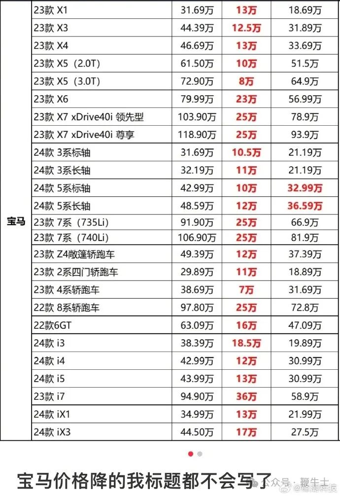 甚至小红书上网友调侃,这宝马汽车降价降得不知道该怎么写标题了并配上了以下的宝马车系降价对照图。