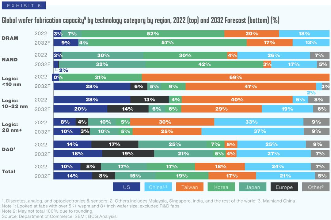 SIA最近公开了一份报告,报告中显示,而如果没有《芯片法案》,到2032年,美国的份额预计将下降到全球容量的8%。而有了《芯片法案》,2022年至2032年间,美国的晶圆厂产能将增加203%,是增幅最快的国家,最终顶尖制造能力将从韩国和中国台湾转移到美国。