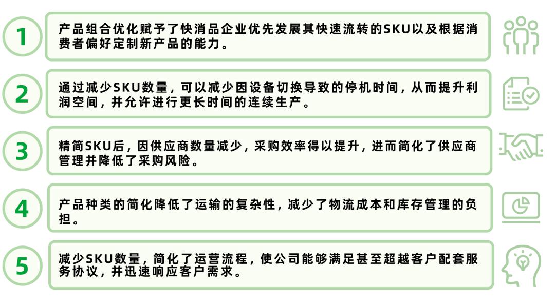 受存储流程简化、仓库中的滞销SKU数量减少以及运输的便捷性提升的影响,物流和库存管理的成本也会相应降低。此外,随着需要管理的SKU数量减少,快消品企业将能够增强其应对市场变化的能力和提升服务水平,进而增强客户满意度。