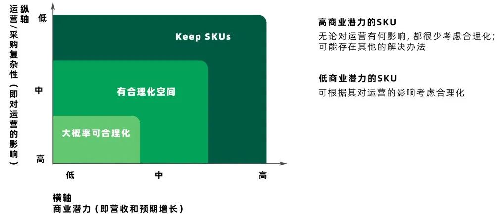 为了最大程度地简化运营和采购流程,并充分发挥收入和预期增长的潜力,快消品企业应考虑根据SKU对运营的影响来淘汰那些商业潜力较低或中等的SKU。与此同时,对于那些商业潜力较高的SKU,即使它们可能对运营产生一定影响,也应尽量避免淘汰。