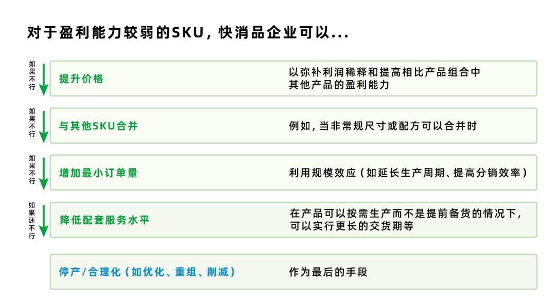 总之,快消品企业首先需要对其产品组合进行全面的审视,并通过严格的活动成本核算来确定每个SKU的“真实盈利能力”。同时,需要对那些盈利能力较低的SKU进行评估,判断它们是否在整个产品组合中扮演了重要的战略角色。