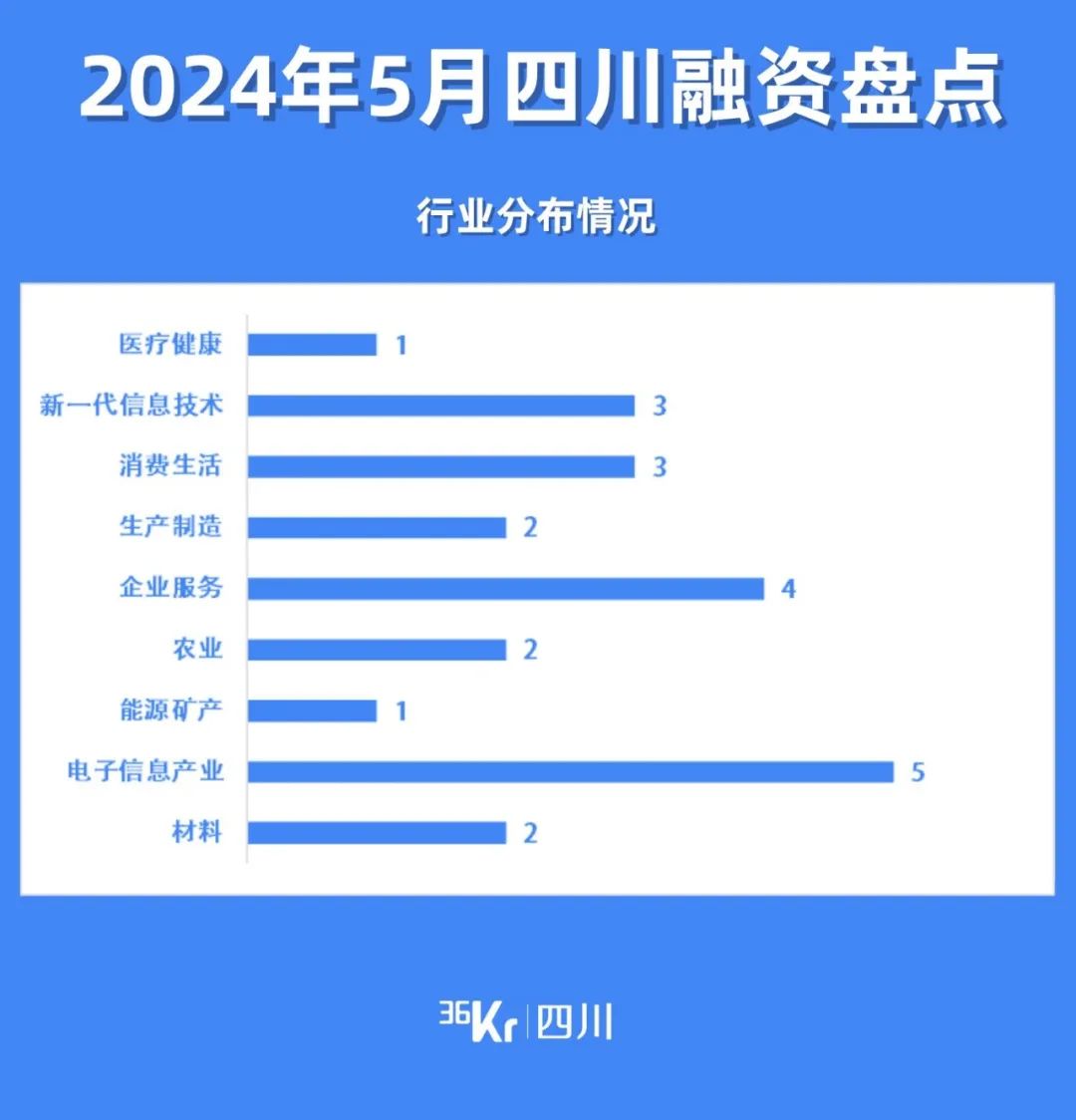 在行业分布上,四川本月电子信息产业发生5起,企业服务发生4起,新一代信息技术发生3起,消费生活发生3起,生产制造发生2起,材料发生2起,农业发生2起,医疗健康发生1起,能源矿产发生1起。