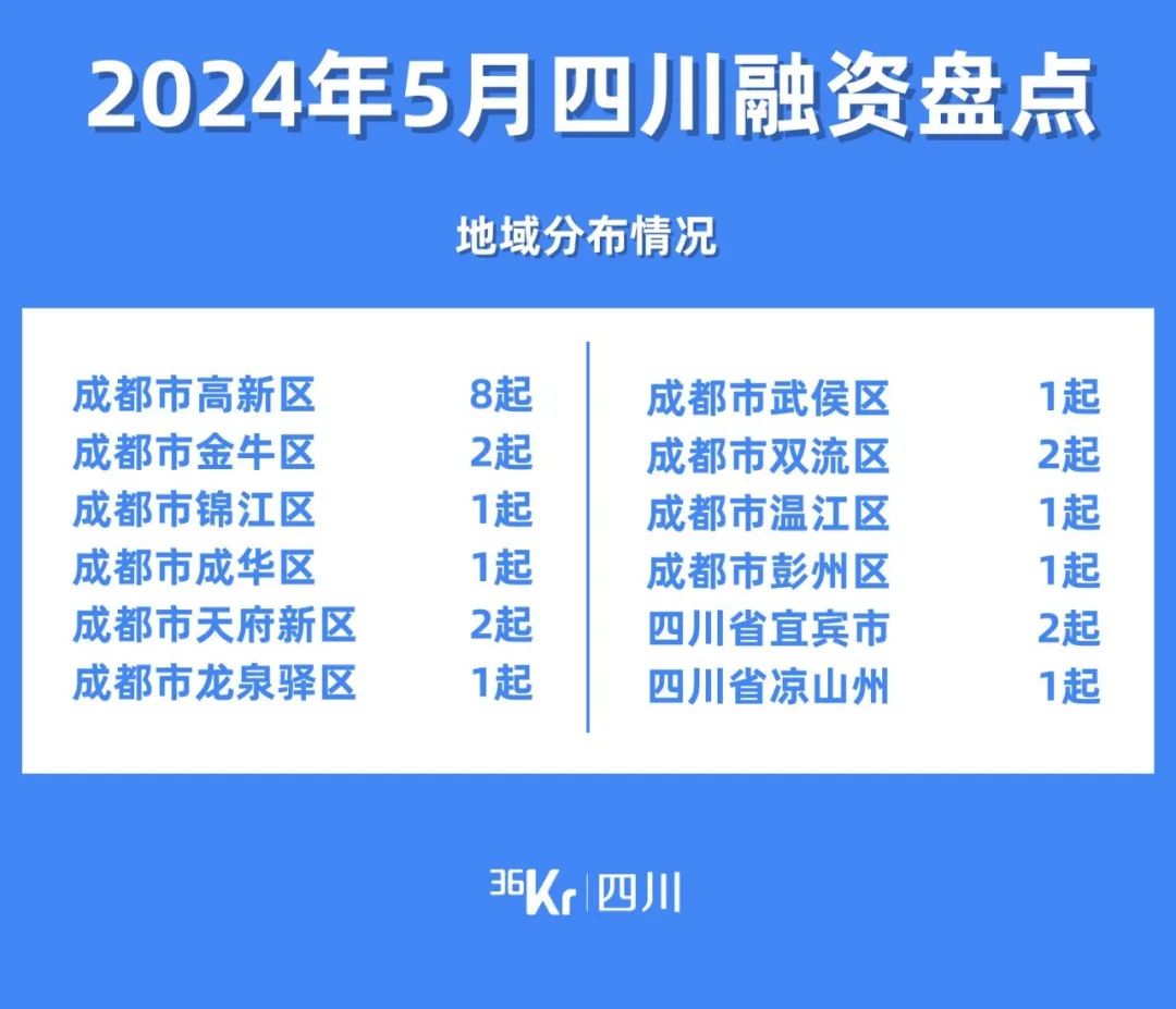 2024年5月,36Kr四川通过公开渠道,共收录与四川相关的融资、上市等事件23起,涉及相关企业23家。