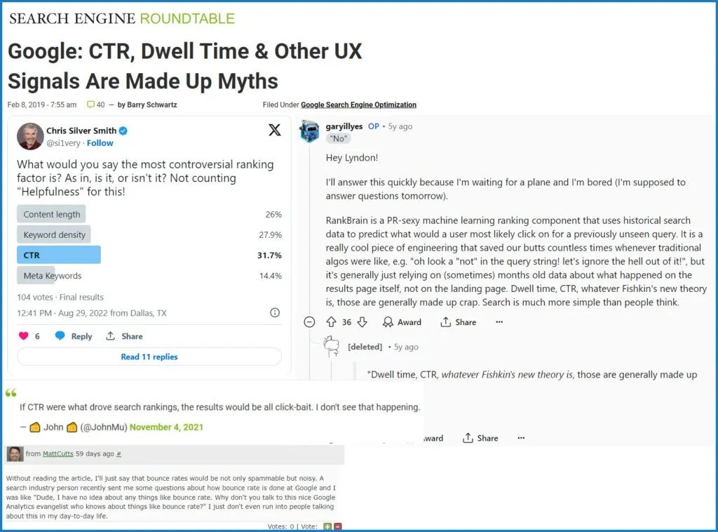 然而——铛铛铛!2017 年的时候,谷歌搜索关系团队( Search Relations team )的负责人 John Mueller 在一次采访中说,谷歌没有直接在搜索排名算法中使用点击量数据和用户行为数据。