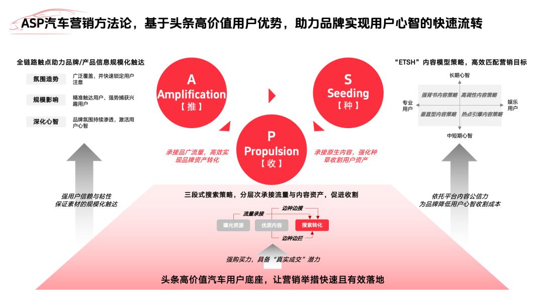 在坐拥人群价值与资源价值双重优势的基础上,今日头条面向全车企品牌,提出了行之有效的ASP汽车营销方法论,基于头条高价值用户底座,助力品牌实现用户心智进一步转化。其中,A(推)即曝光扩大流量(Amplification),通过全链路触点助力,高效海量触达;S(种)即强化种草(Seeding),在各个宣推时期都有不同的内容策略与之相对应,力求达成用户心智影响的最佳传播效果;P(收)即推进心智转化(Propulsion),将推、种两阶段积累起来的流量通过搜索途径有效释放出来。“推——种——收”三者相辅相成,为车企提供可落地营销解决方案。
