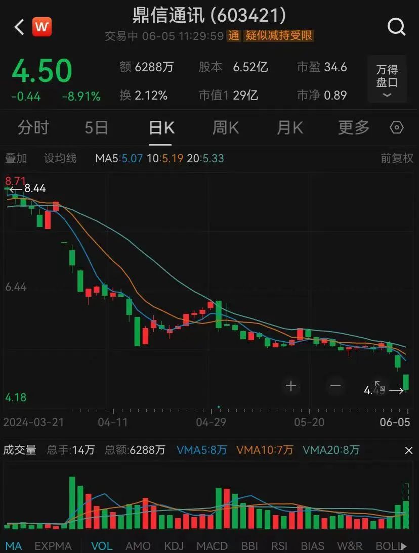 6月5日,鼎信通讯早盘大幅低开,股价急剧下滑。截至午间收盘跌8.91%,报价4.5元/股,市场情绪受到明显影响。