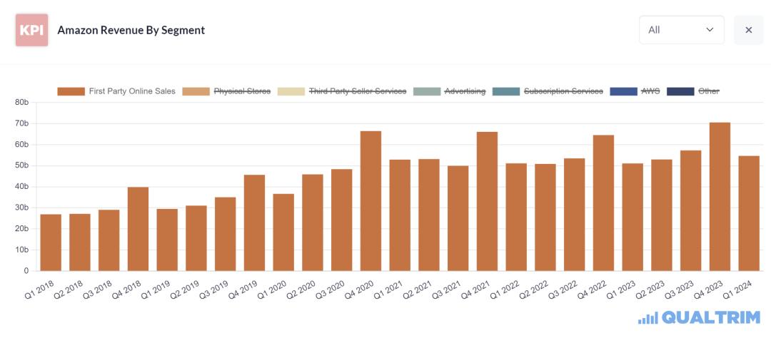 过去六年各季度亚马逊电商业务收入图。来源:qualtrim