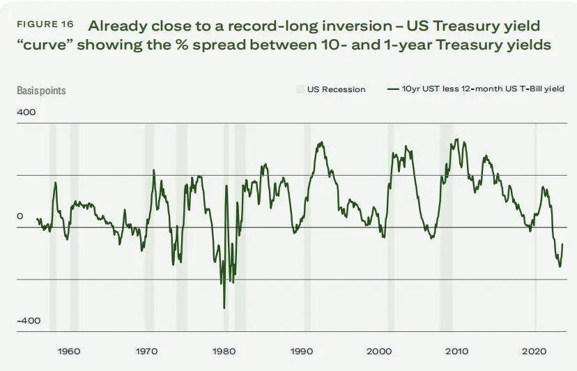 过去60年来,约有82%的时间,美国国债1年期/10年期收益率曲线中呈正斜率。它可能会因长期利率上升和/或短期利率下降而变得陡峭。美国收益率曲线倒挂的最长周期已达20个月。
