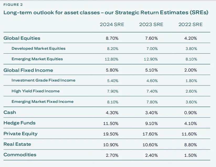 另一方面,新兴市场(EM)股票在2023年经历了价格和收益的挫折,导致估值更高。因此,我们预测SRE将从12.9%略微下降至12.8%。目前,10年期投资级固定收益债券的预期SRE为5.4%,略高于去年。