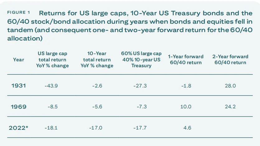 经典的“60/40”股票/债券配置双方之前均被抛售是在1931年和1969年。两年后,进入1934年和1972年,核心分配增加了20%以上。虽然没有人知道在惨淡的2022年之后,我们将如何进入2025 年,但我们相信股票和债券的机会就在眼前。