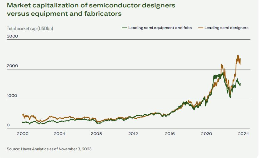 然而随着人工智能芯片设计领域的竞争日益激烈,一些生成式人工智能产品可能在商业上失败或在竞争中落后。如下图所示,前十大半导体设备制造商的市值突然落后于半导体生产商的市值。