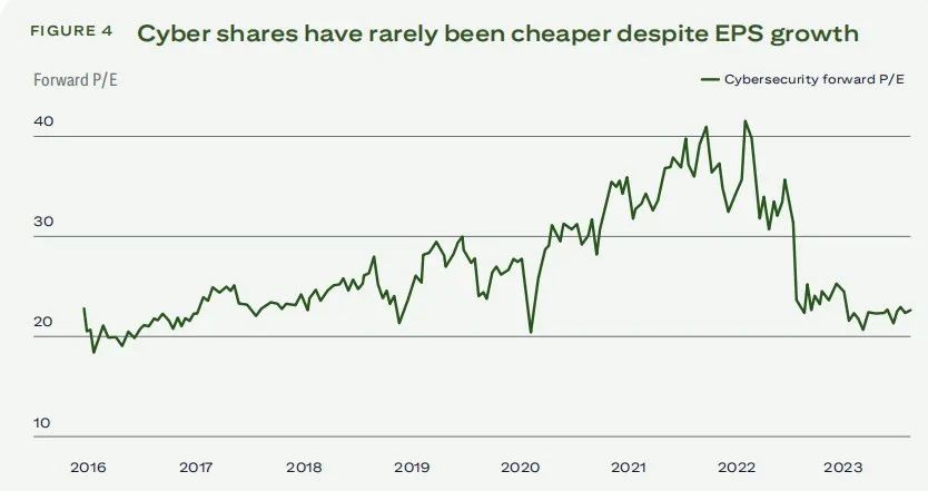 截至2023年10月31日,纳斯达克CTA网络安全公司实现了14%的盈利增长(而标准普尔500指数整体为-0.4%)。然而网络安全类股未能跟上这种持续的、超过市场的盈利增长。它的估值徘徊在大流行初期的低点附近。展望2024年,我们将看到,在一个不确定的世界里,网络安全股将成为可靠的利润增长来源。