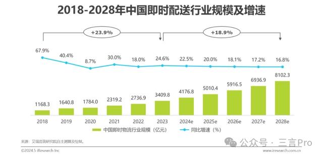 根据艾瑞咨询发布的《中国即时配送行业研究报告》显示,未来五年,即时配送行业规模将翻番,2023年约3410亿元,2028年或将超过8100亿元。