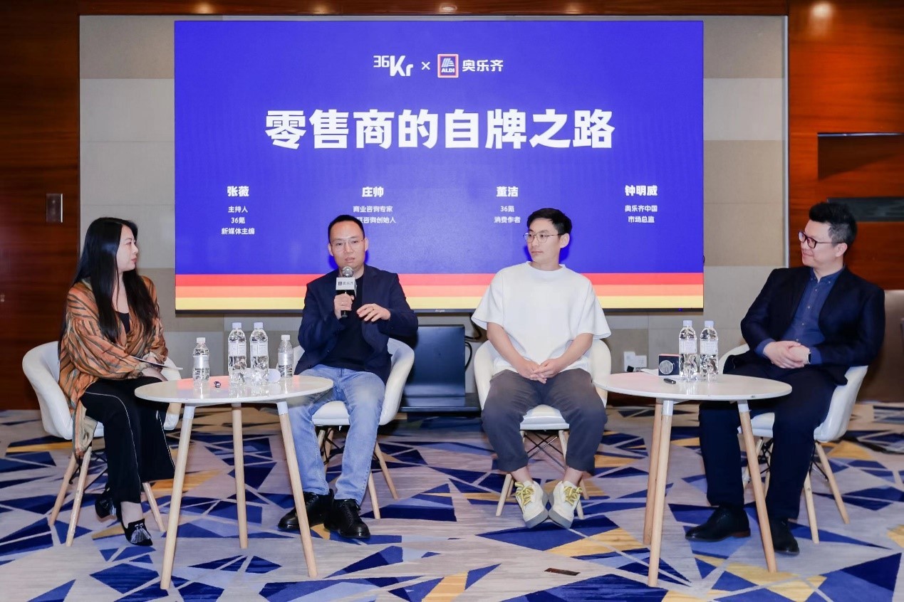 图注:“零售商的自牌之路”圆桌分享,嘉宾从左至右为:主持人36氪新媒体总监张薇,商业咨询专家、百联咨询创始人庄帅,36氪消费作者董洁,ALDI奥乐齐中国市场总监钟明威
