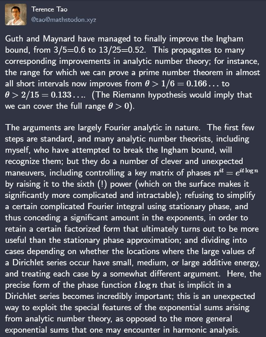 Guth 和 Maynard 最终改进了 Ingham 边界,从 3/5=0.6 提高到 13/25=0.52。这在解析数论中产生了许多相应的改进,例如,研究者可以在几乎所有短区间内证明素数定理的范围,现在从 θ>1/6=0.166… 到 θ>2/15=0.133…