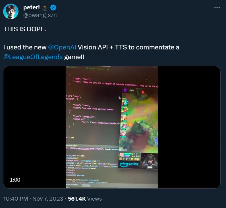 除了科技大厂,加强 AI 对游戏的理解,许多开发者也已跃跃欲试。在 OpenAI 刚推出第一个多模态大模型 GPT-4V 时, X 平台(原推特)博主 @pwang_szn 晒出了自己用 OpenAI 视觉 API 解说 LOL,这个 demo 用到的是 LNG 与 T1 的一场比赛视频,引起了全网 50 多万网友的围观。