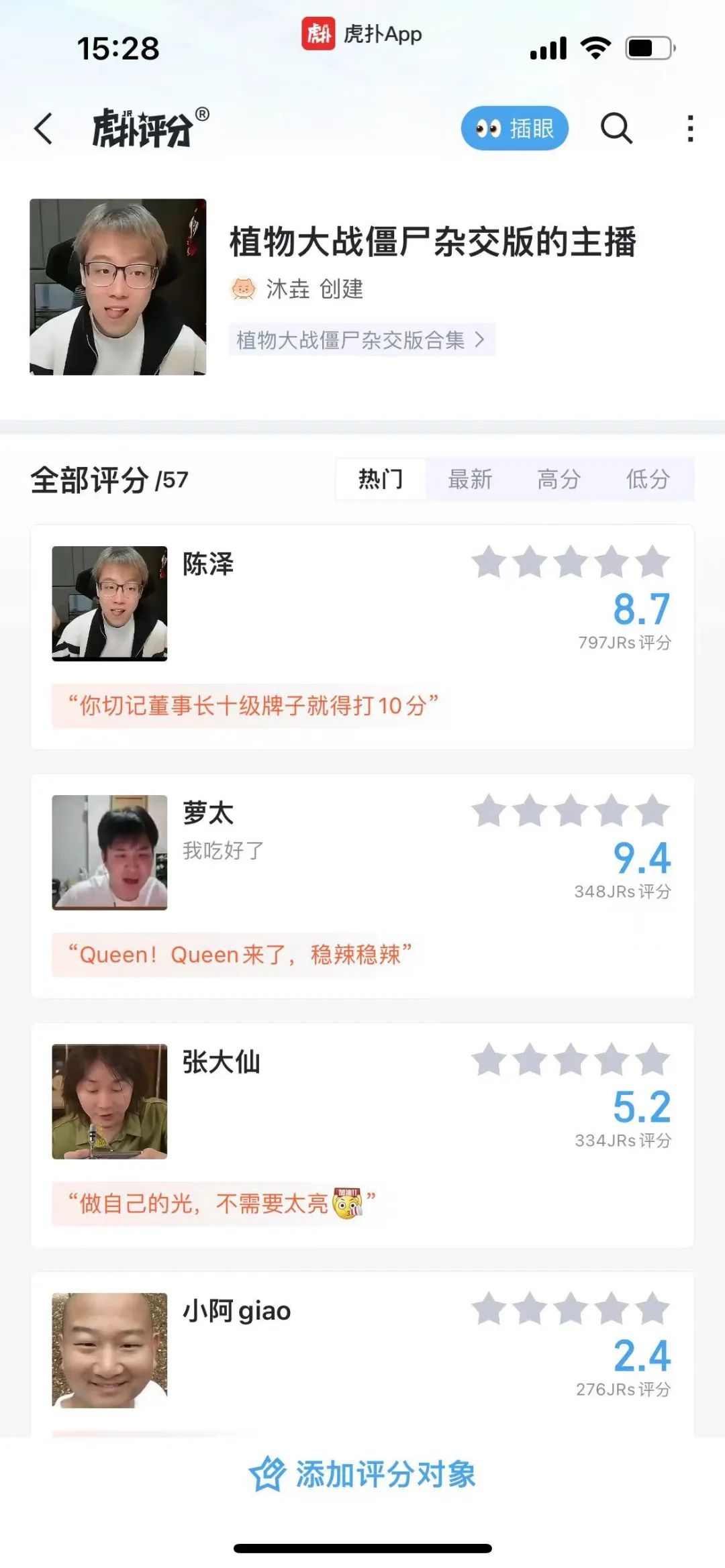但更让我们意外的是,我们竟然发现了一个「植物大战僵尸杂交版主播」这样一个评分,很多主播都被罗列其中,陈泽更是当仁不让的排在了第一。