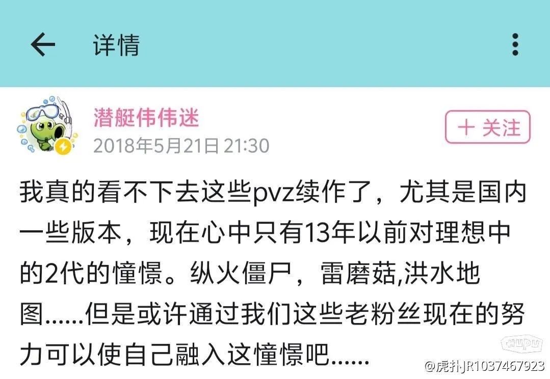更早的2018年,「潜艇伟伟迷」发布了这样一个动态,「我真的看不下去这些pvz续作了,尤其是国内一些版本,现在心中只有13年以前对理想中的2代的憧憬。纵火僵尸,雷磨菇,洪水地图…但是或许通过我们这些老粉丝现在的努力可以使自己融入这憧憬吧......」