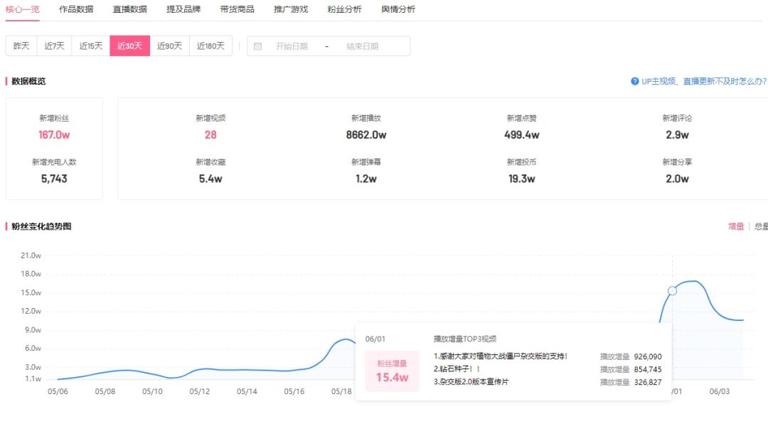 目前,「潜艇伟伟迷」在B站有接近250万粉丝,这250万的粉丝当中,根据飞瓜的数据监测,近30天的涨粉数量是167万。