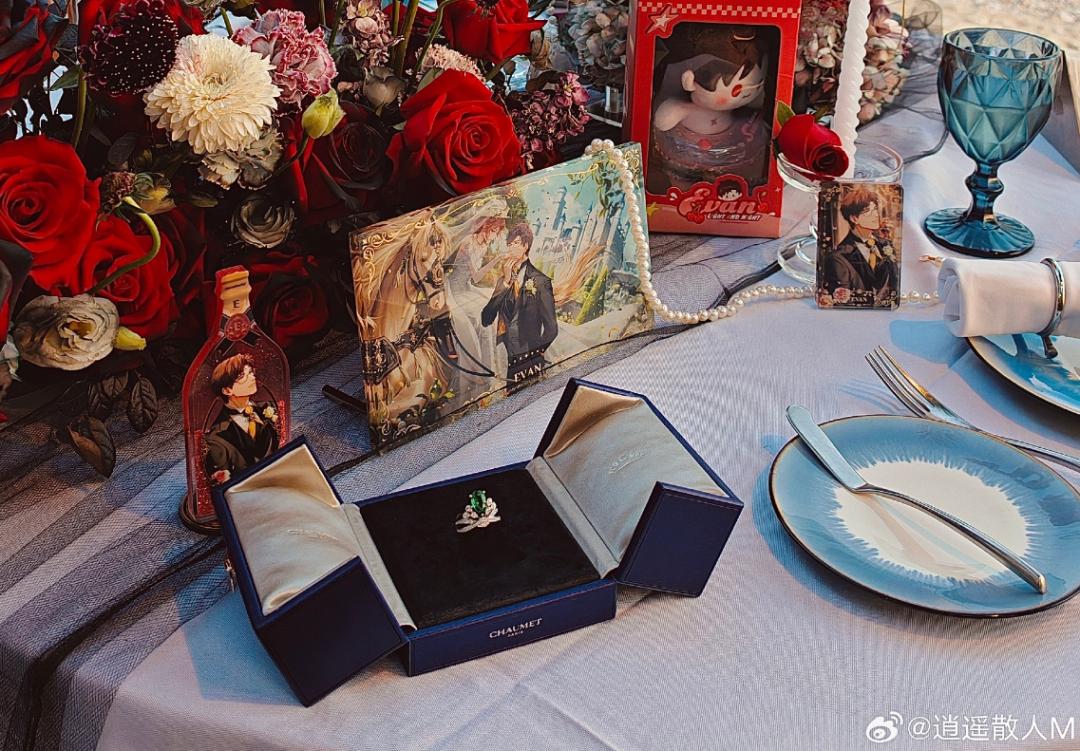 这场位于海边的求婚仪式,乍一看倒像是国乙小姐妹的茶话会——小圆桌上摆满了《光与夜之恋》男主陆沉的各种谷子(周边),就连散人用的求婚戒指都被明眼人指出,是陆沉联动高奢尚美的定制款,保守估计120万起步。