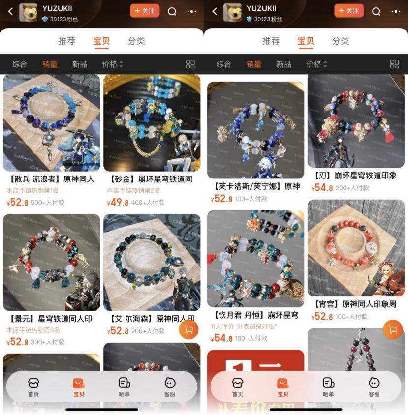 像那些个人小作坊式的手作人,也能赚到玩家的钱。玩家提供图片,她们根据图片进行配色设计做饰品,这类主打“定制”的手工制品,价格不贵,一条手链三五十块钱,却满足了玩家那颗“想要独一无二”的心。