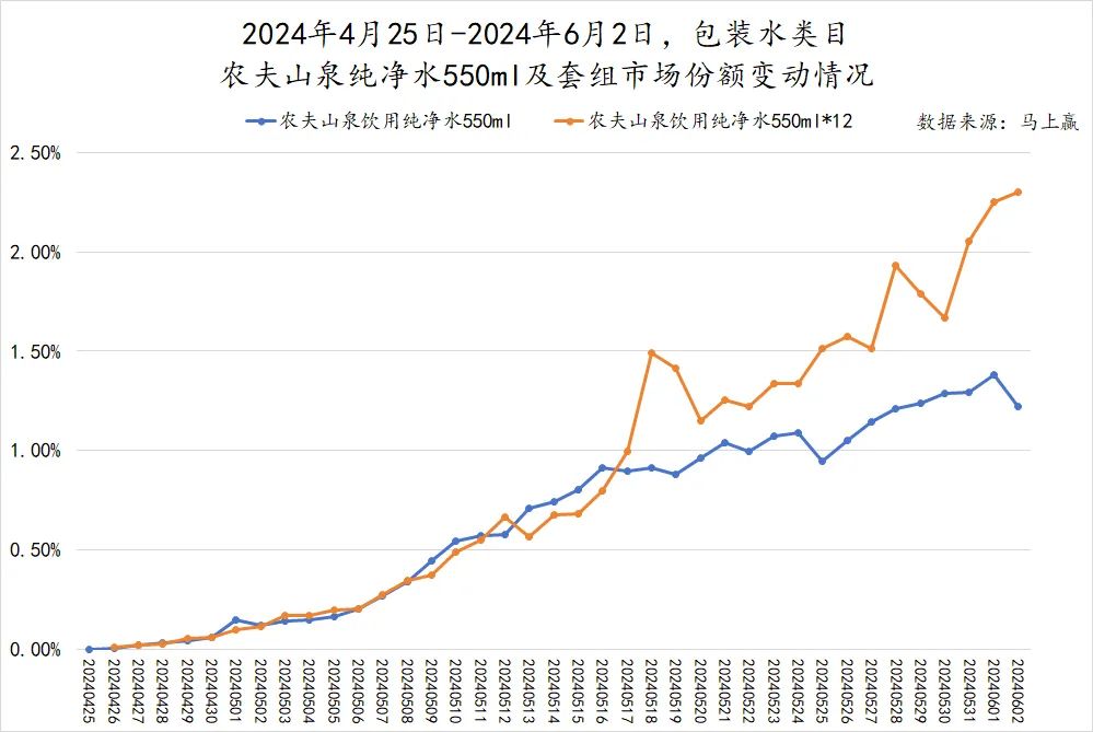 根据小食代从马上赢获取的数据,从4月底至今,农夫山泉纯净水(550ml)和纯净水(550套组)的市场份额均呈现波动增长。而元气森林纯净水由于上架时间不久,暂时并未获得相关数据。