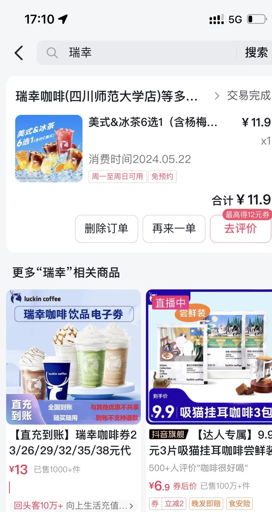 而瑞幸的线上带货,其实是玩得本地团购券那一套。线上购买电子卷,然后在店里用小程序下单,可以买到11.9元的美式&冰茶。他本质还是引流到线下杯装产品,并不是在线上做配送,或者是卖货粉末、浓缩液那种咖啡品类。