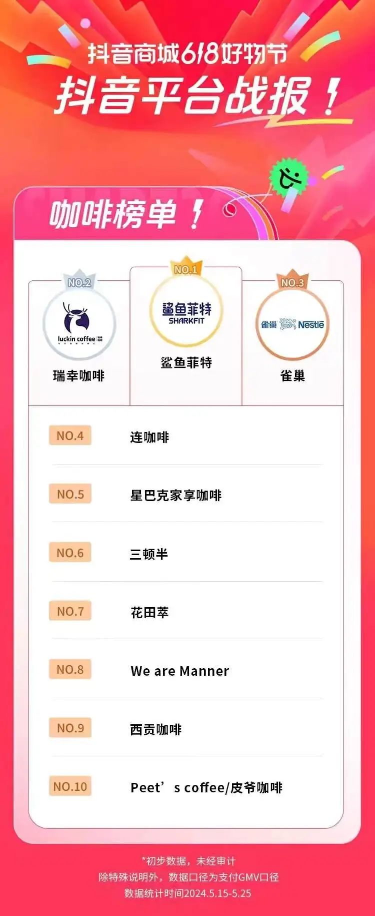 当然,国产品牌也在努力跟进。根据最新的市场调研数据,鲨鱼菲特线上近7日的销售额达250万到500万,是618期间的线上咖啡品牌第一;榜二大哥瑞幸咖啡也毫不逊色,线上日销售额可达50万;雀巢咖啡、连咖啡、三顿半等品牌销售额同样显著提升。