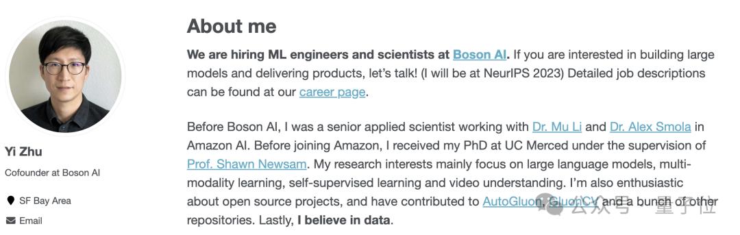 同样曾在亚马逊AI团队,担任高级应用科学家。研究主要关注大语言模型、多模态学习、自监督学习和视频理解,曾参与AutoGluon、GluonCV等开源项目。