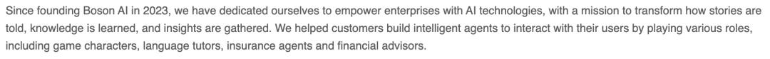 自2023年成立Boson AI以来,我们一直致力于利用AI技术为企业赋能,旨在革新故事讲述、知识学习和信息洞察的方式。我们协助客户开发Agent,使其能够扮演多种角色,如游戏角色、语言教师、保险代理和金融顾问。