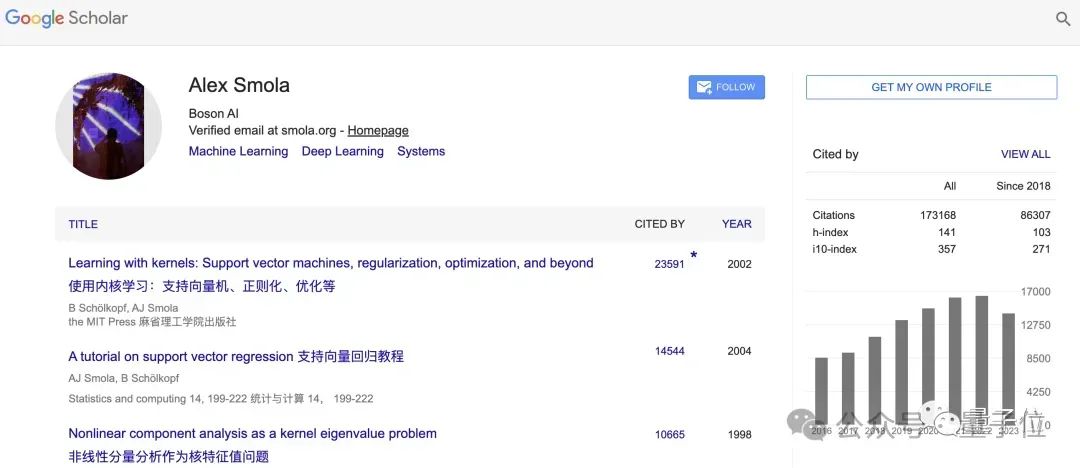 直接上数据:Smola在Google Scholar上的被引用次数,超过17万次。其中,被引次数前三的所著论文,被引数统统破万。