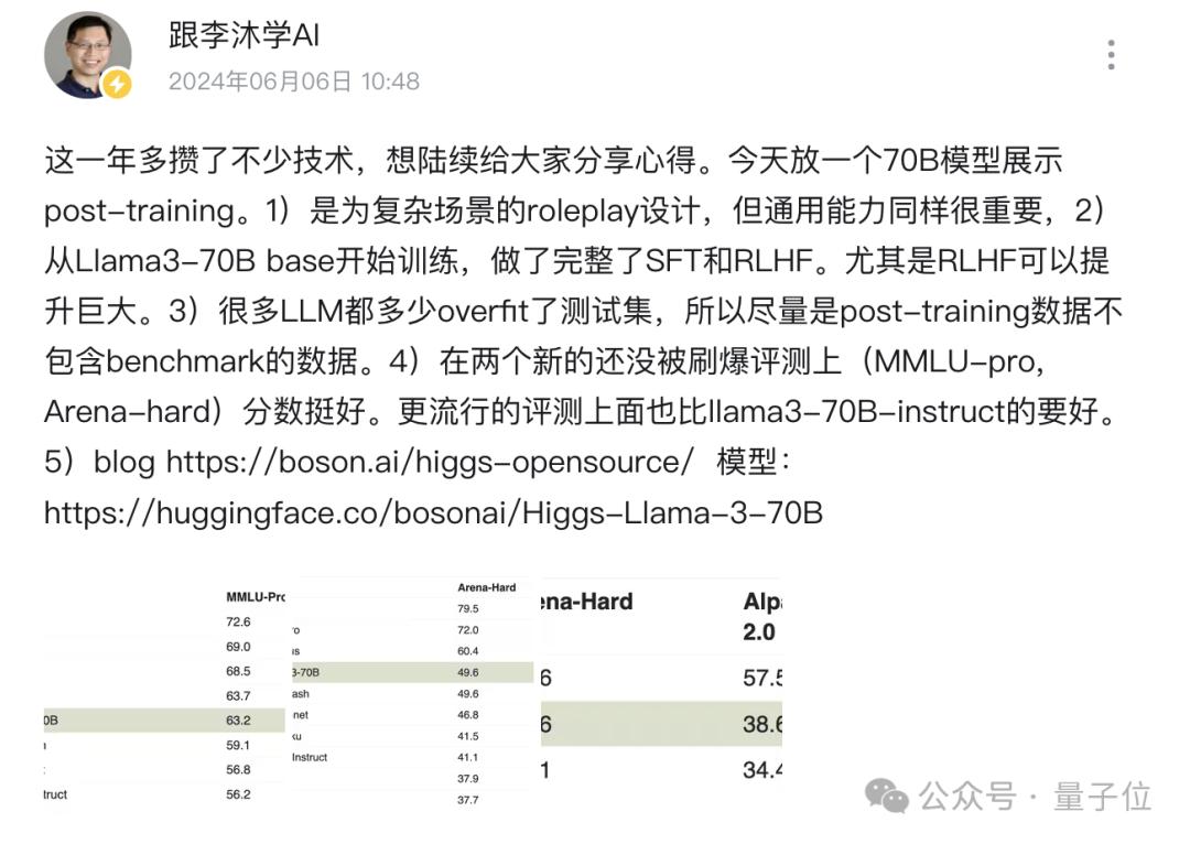 定睛一看,Higgs-Llama-3-70B是沐神去年联合创立的公司Boson AI,推出的Higgs开源系列大模型中的第一个,基于Llama 3打造,做了完整的SFT、RLHF。