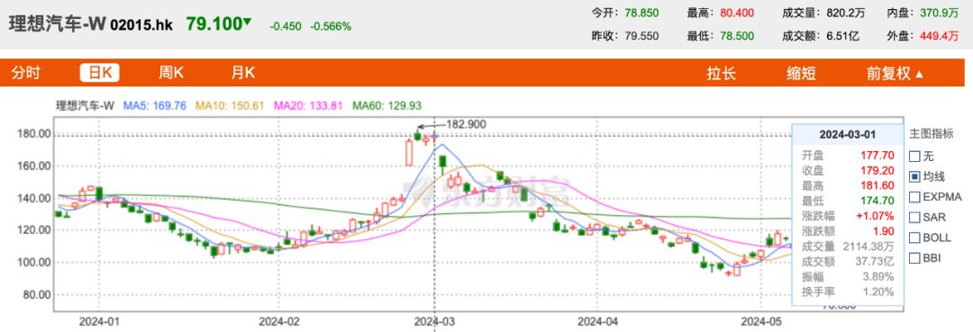 东方财富网数据显示,3月1日,MEGA上市首日,理想汽车港股以177.7港元每股的价格开盘,到6月5日收盘,理想股价已跌到79.1港元/股,市值跌至1679亿港元。3个月时间里,理想市值缩水约2092亿港元,跌去了一个“现在的自己”。