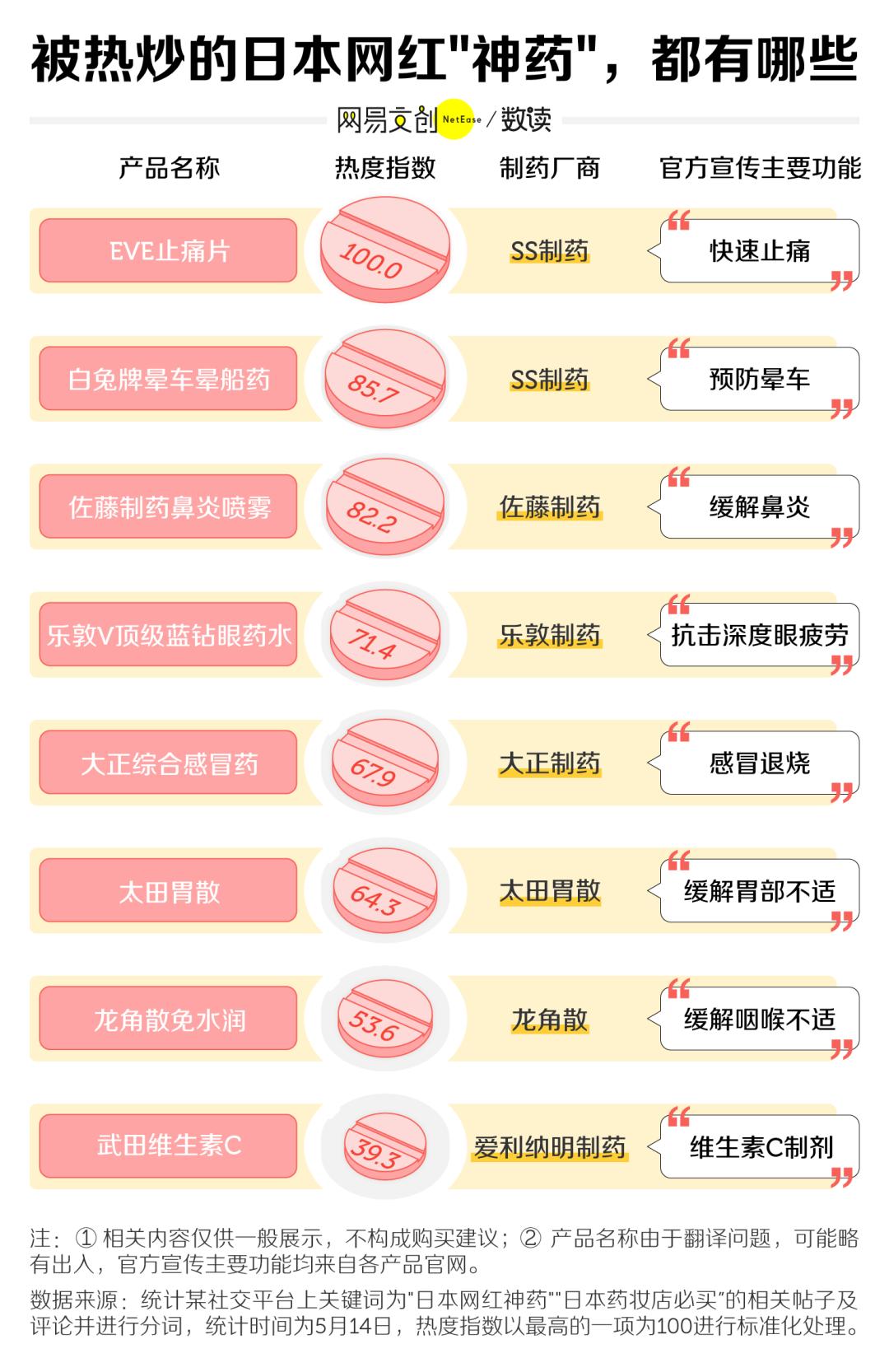 我们对这些帖子进行整理后发现,分享频率最高的产品前三名分别是“快速缓解严重头疼”的 EVE 止痛片、“现代人出远门必备良药”的白兔牌晕车晕船药、对鼻炎患者有“神效”的佐藤制药鼻炎喷雾。