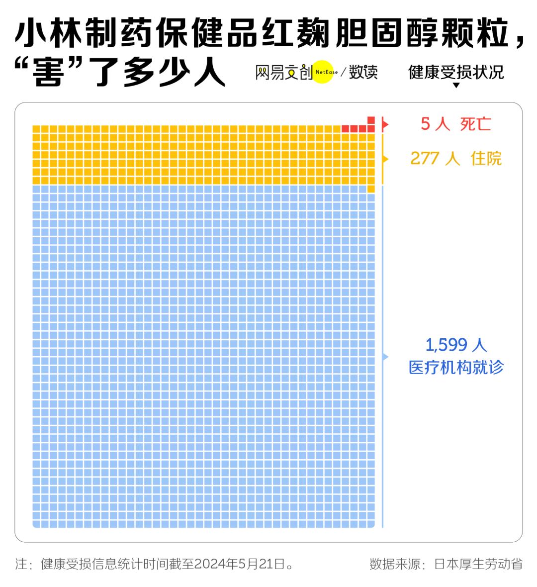 截至 5 月 21 日,该产品已造成 5 例死亡,277 人住院,另有 1599 人前往医疗机构就诊。