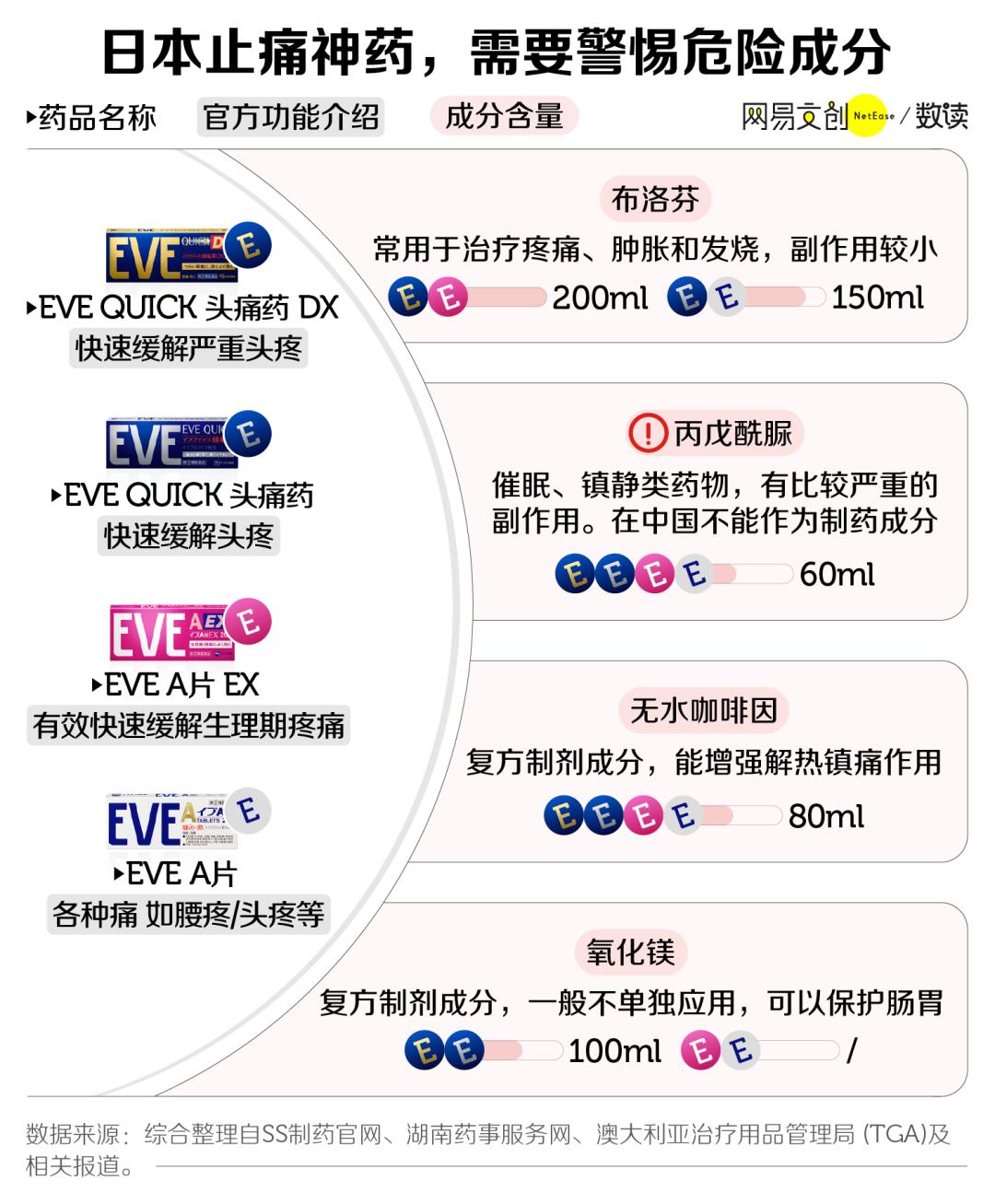虽然 EVE 系列止痛片“贴心”细分为了四款,既有快速缓解严重头疼的,也有针对缓解生理期疼痛的,但本质就是布洛芬、丙戊酰脲、无水咖啡因和氧化镁四种成分的排列组合。