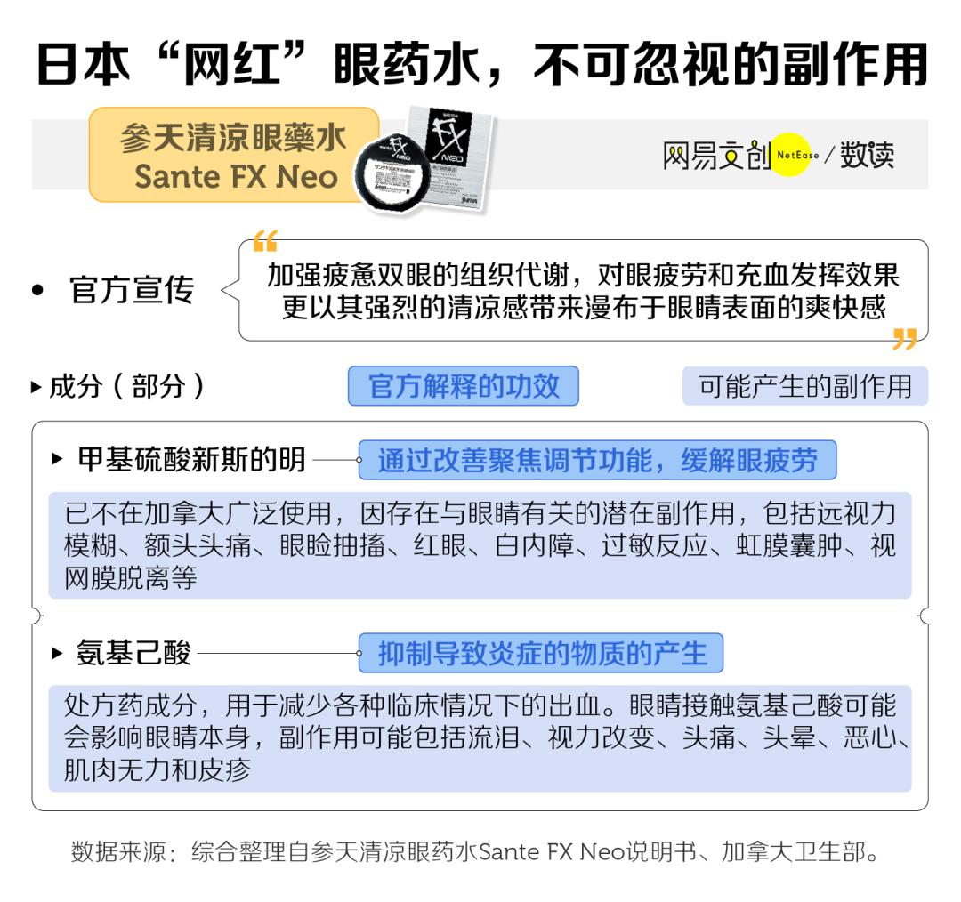 此外该款眼药水还有处方药成分氨基己酸,可能导致流泪、视力改变和头痛等副作用,并不建议随意滥用 [5]。