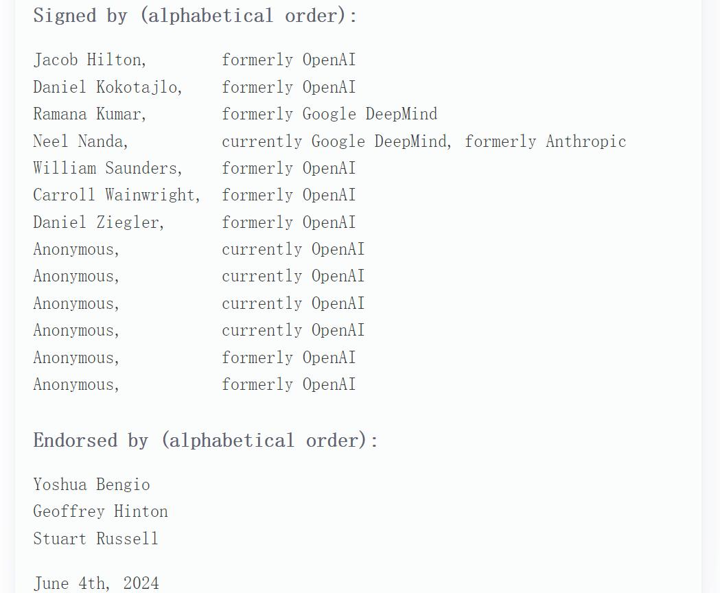 在公开信的署名栏,可以看到签署公开信的多位 OpenAI 前任雇员曾从事人工智能安全工作。