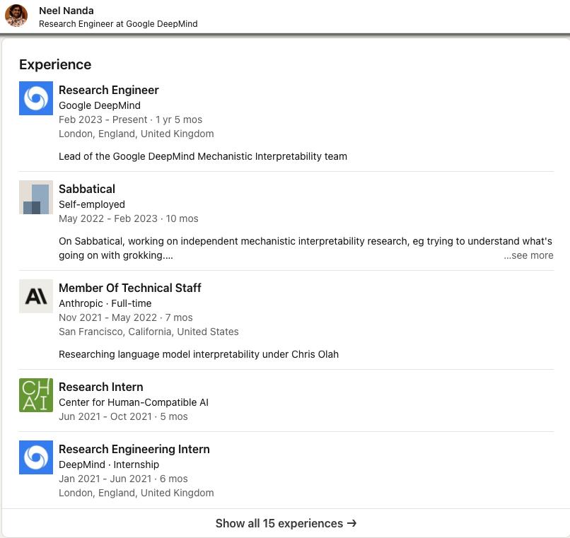 Neel Nanda 毕业于剑桥大学,从其工作经历来看,同样具备AI安全背景。
