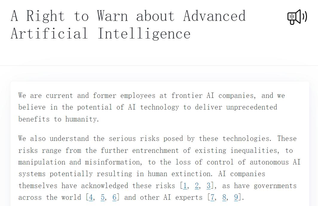 该份公开信刊载在 righttowarn.ai 网站上,网站域名和公开信的标题皆在捍卫这些顶尖 AI 公司员工对先进人工智能发出警告的权利。