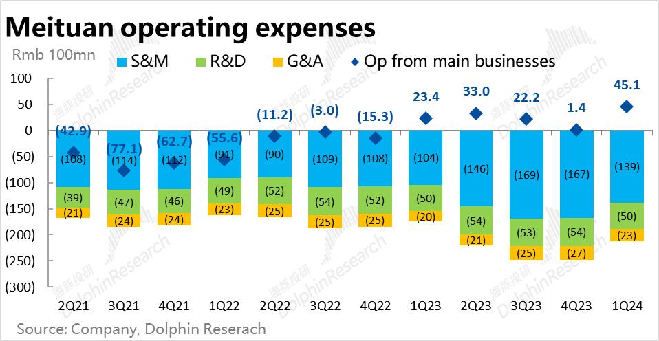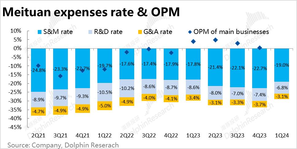 6、费用和利润层面,本季度的毛利率为35.1%,和我们对标的去年3季度35.3%的水平也是基本一致。而营销费用减少近30亿,无疑是释放利润的最主要贡献。对内的研发和管理费用也分别减少了2~3亿,有一定但不大的贡献。美团看起来似乎并无意靠对内大幅控费来释放利润。