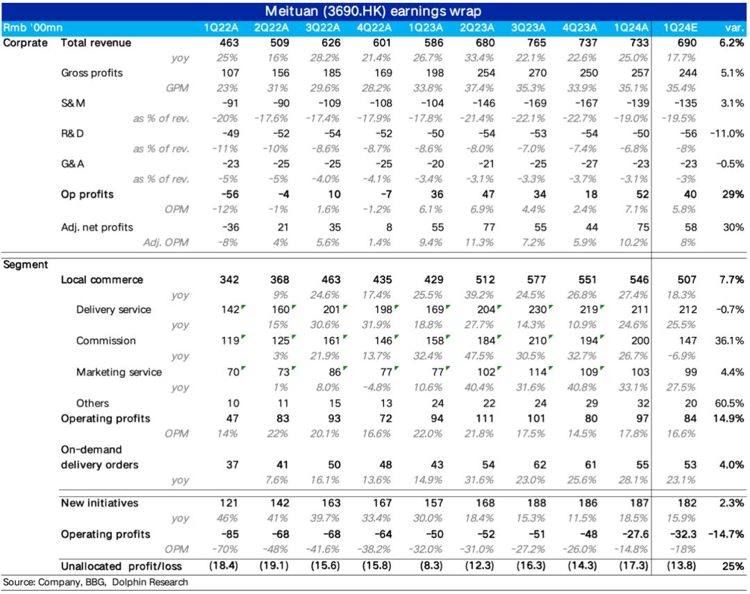 1、整体业绩上,本季度总营收为733亿,看似比预期高出40+亿,但主要是一致预期过低不具参考意义。实际营收应当只是小超预期,且主要归功于超预期的即配单量增长;整体经营利润为52亿,比预期多出12亿,其中新业务减亏和本地商业利润修复都有贡献。