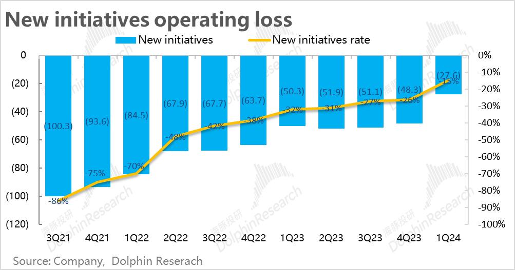 4、新业务减亏超预期交付:在公司明确宣布创新业务以减亏为第一要务后,本季度一方面增速不降反增到18.5%,高于预期的16%。另一方面,本季新业务的亏损下降到了27.6亿,明显低于一致预期的32亿亏损。在增长不降的同时,减亏的进展还是让人满意的。